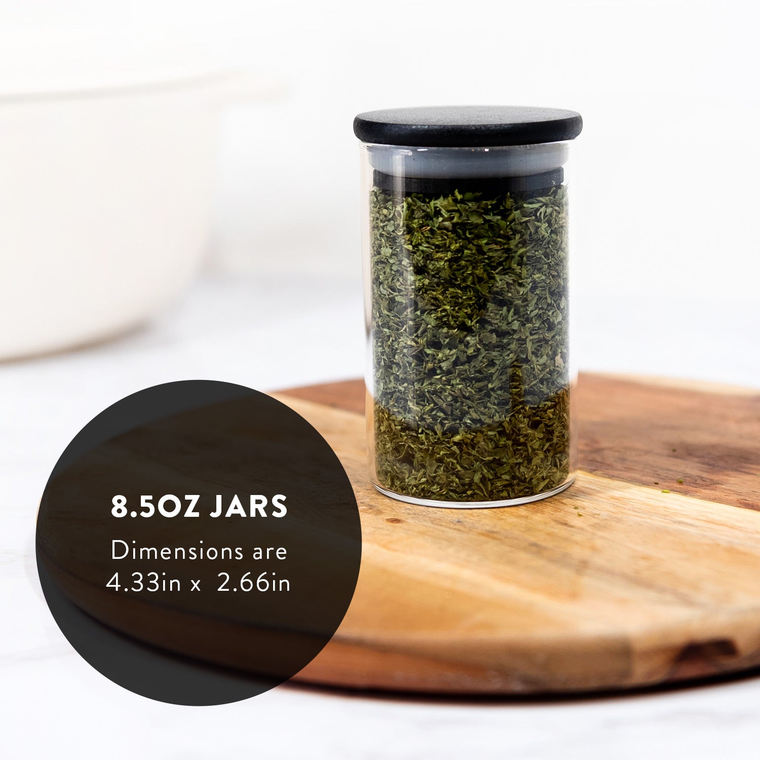 Each spice jar has dimensions of 4.33 inches x 2.66 inches and has a volume of 286 milliliters.